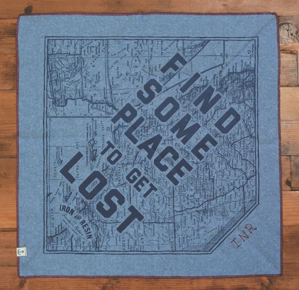 In the spring and summer of 2014 I had the absolute pleasure of interning at Iron and Resin as a designer and artist, Amongst the many projects I helped work on this one was one of my favorites. Working with the creative director I was asked to do a few lettering pieces for the bandana. This was the chosen design and was screen printed on vintage maps. These bandanas were chain stitched with peoples names at events are available on the website by clicking on the image below.